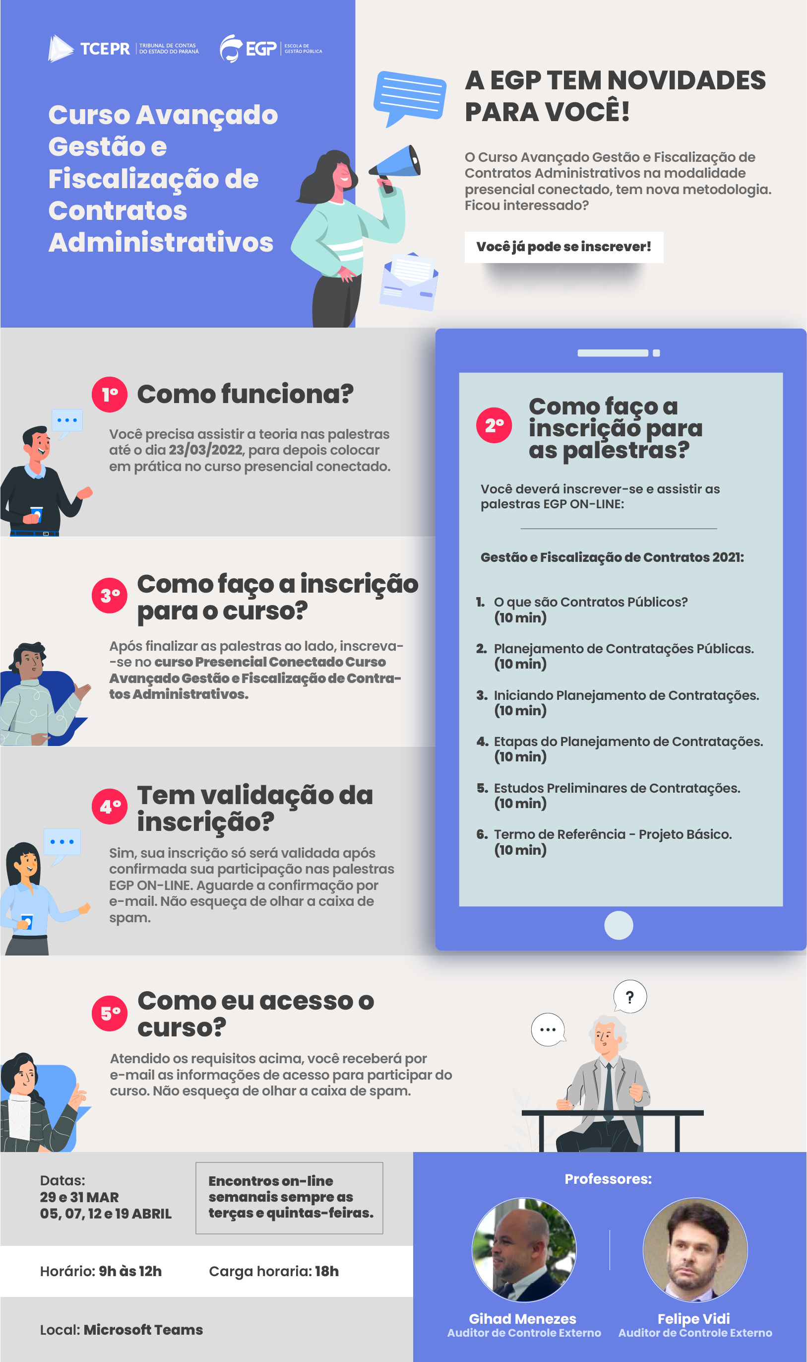 ATENÇÃO: É necessário assistir a teoria nas palestras até o dia 23/03 para depois colocar em prática no curso presencial conectado. Veja todos os detalhes logo abaixo, em OBJETIVO. O que são Contratos Públicos; Planejamento de Contratações Públicas; Iniciando Planejamento de Contratações; Etapas do Planejamento de Contratações; Estudos Preliminares de Contratações;Termo de Referência - Projeto Básico.