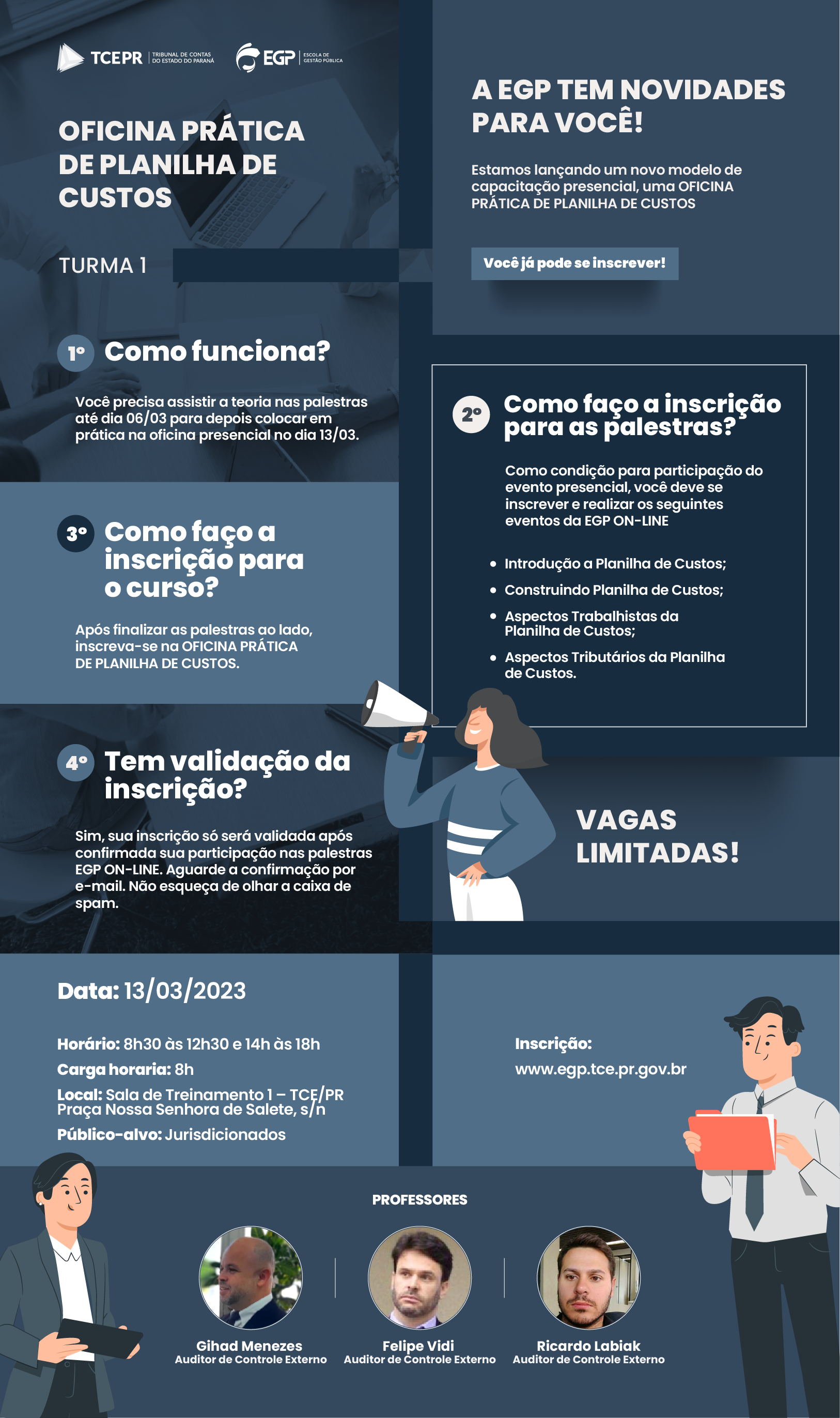 Aplicar problemas do cotidiano na planilha de custos, por meio de cases práticos e a partir disso, fomentar as melhores soluções na elaboração das planilhas de custos nos serviços de vigilância, de limpeza e de resíduos sólidos. Como condição para participação do evento presencial, você deve se inscrever e realizar os seguintes eventos da EGP ON-LINE: • Introdução a Planilha de Custos (40min); • Construindo Planilha de Custos (2h); • Aspectos Trabalhistas da Planilha de Custos; • Aspectos Tributários da Planilha de Custos.