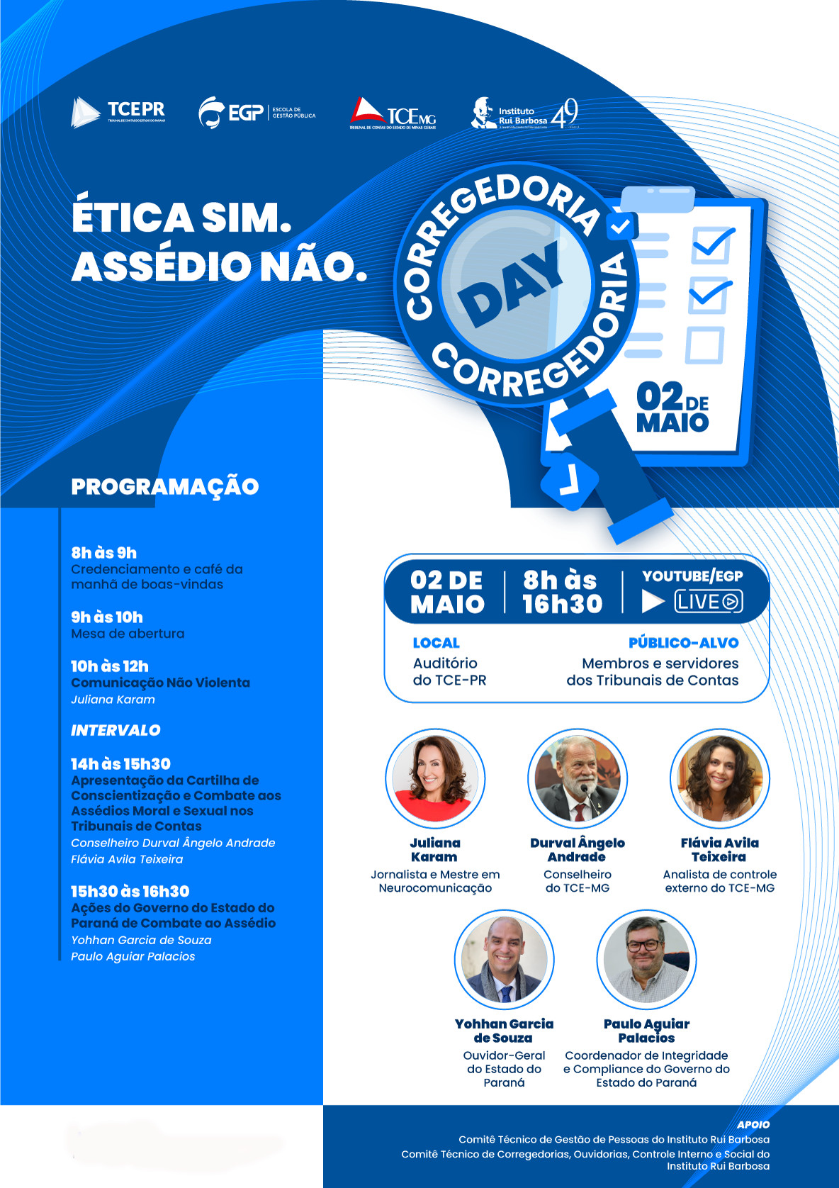 Evento “ÉTICA SIM, ASSÉDIO NÃO” – para celebrar o Dia Nacional da Ética e Corregedoria Day. O Evento vai ser sediado pelo TCEPR e transmitido no Youtube para todos os Membros e servidores dos Tribunais de Contas.