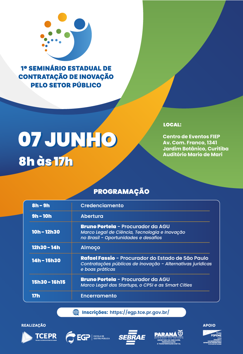 No dia 7 de junho de 2023, o TCEPR, SEBRAE e o Governo do Estado do Paraná, - Secretaria de Estado da Inovação, Modernização e Transformação Digital, na cidade de Curitiba, realizarão o 1º Seminário Estadual de Contratação de Inovação pelo setor público, com o apoio da FOPEME.