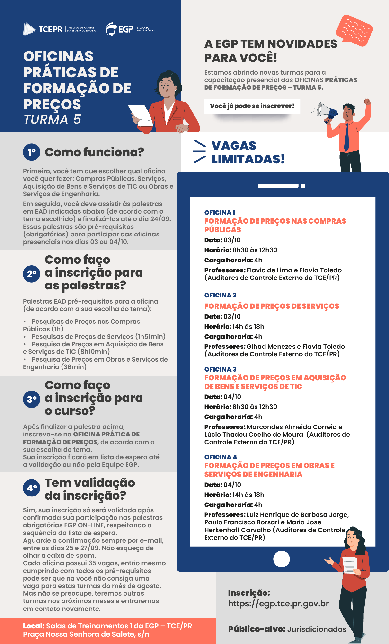 Aplicar problemas do cotidiano na orçamentação dos preços, por meio de cases práticos e a partir disso, fomentar as melhores soluções nas pesquisa de preços relativa à área de serviços. Você deverá inscrever-se e assistir a palestra EGP ON-LINE (de acordo com a sua escolha do tema) • Pesquisas de Preços de Serviços (1h51min)