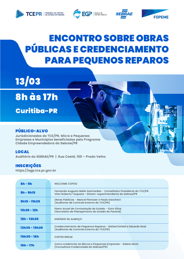 Público-alvo: jurisdicionados do TCE/PR, Micro e Pequenas Empresas e municípios beneficiados pelo Programa Cidade Empreendedora do SEBRAE/PR.