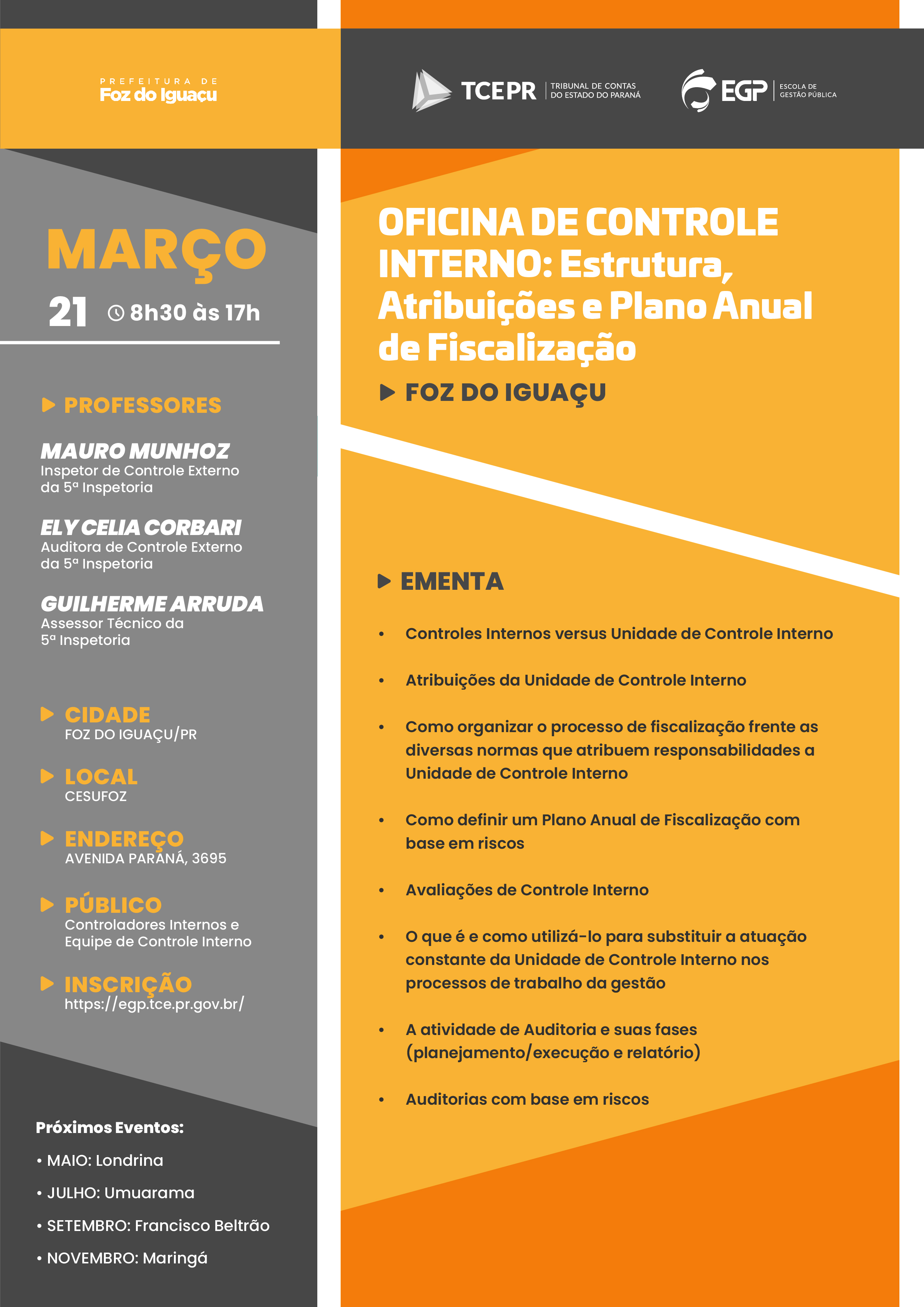 Este evento abordará sobre o papel da Unidade de Controle Interno como responsável pelas auditorias e avaliações de controles internos instituídos pelos gestores nas mais diversas operações da organização pública. Abordará também sobre como identificar temas de auditoria e como priorizá-los frente a diversidade de demandas da Unidade de Controle Interno.
