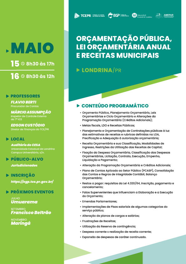 Público-alvo: Vereadores e Servidores de Câmaras de Vereadores, Servidores Municipais do Departamento de Arrecadação Tributária e das Secretarias de Finanças e demais Servidores de Prefeituras. Próximos eventos: Julho - Umuarama Setembro - Francisco Beltrão Novembro - Maringá