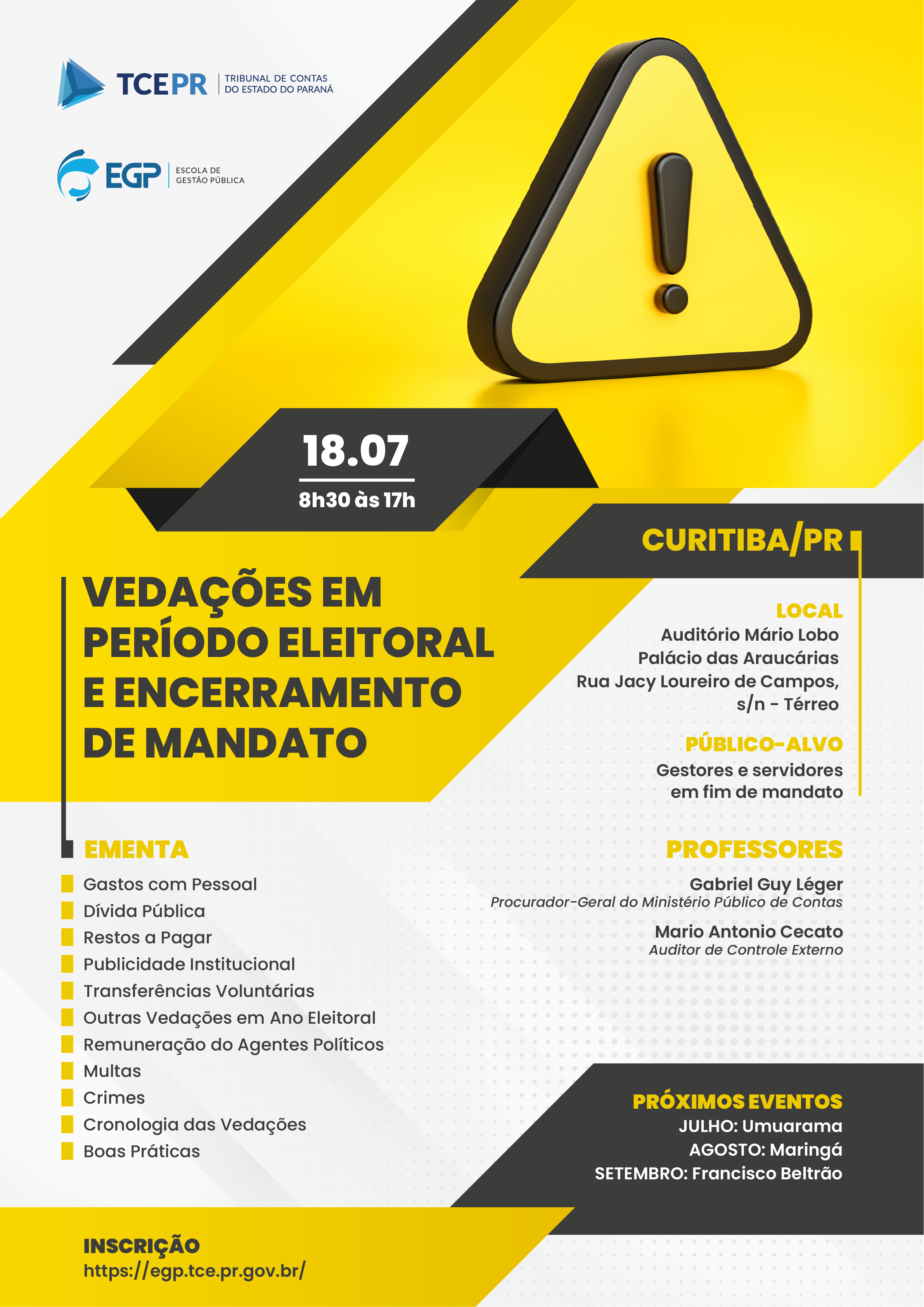 Público-alvo: gestores e servidores em fim de mandato. Próximos eventos: Julho - Umuarama; Agosto - Maringá; Setembro - Francisco Beltrão.