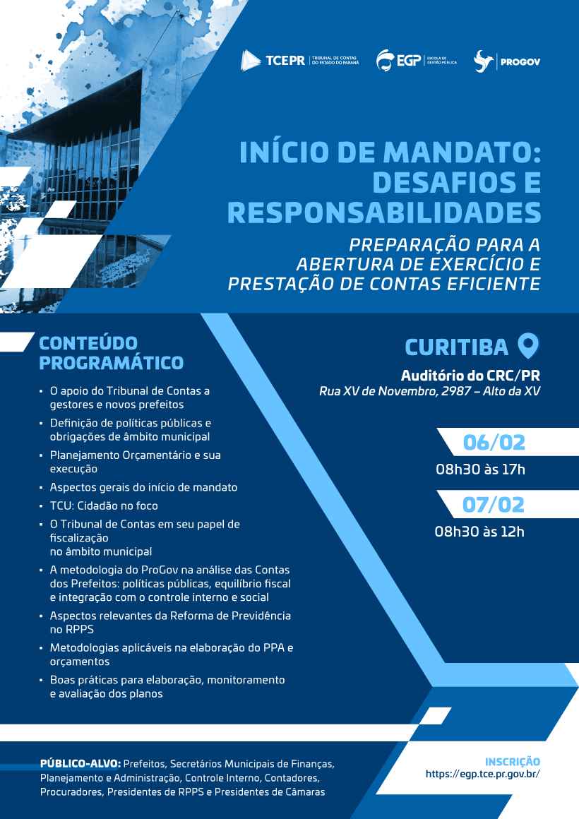 Público-alvo: Prefeitos, Secretários Municipais de Finanças, Planejamento e Administração, Controle Interno, Contadores, Procuradores, Presidentes de RPPS, Presidentes de Câmaras. Próximos eventos: AMSOP - 10 e 11/02; AMEPAR e AMUVI - 20 e 21/02; AMOP - 13 e 14/03; AMSULPAR, AMCESPAR, CANTUQUIRIGUAÇU e AMOCENTRO - 20 e 21/03; AMERIOS e COMCAM - 27 e 28/03; AMUNOP e AMUNORPI - 10 e 11/04; AMUNPAR e AMUSEP - 24 e 25/04.