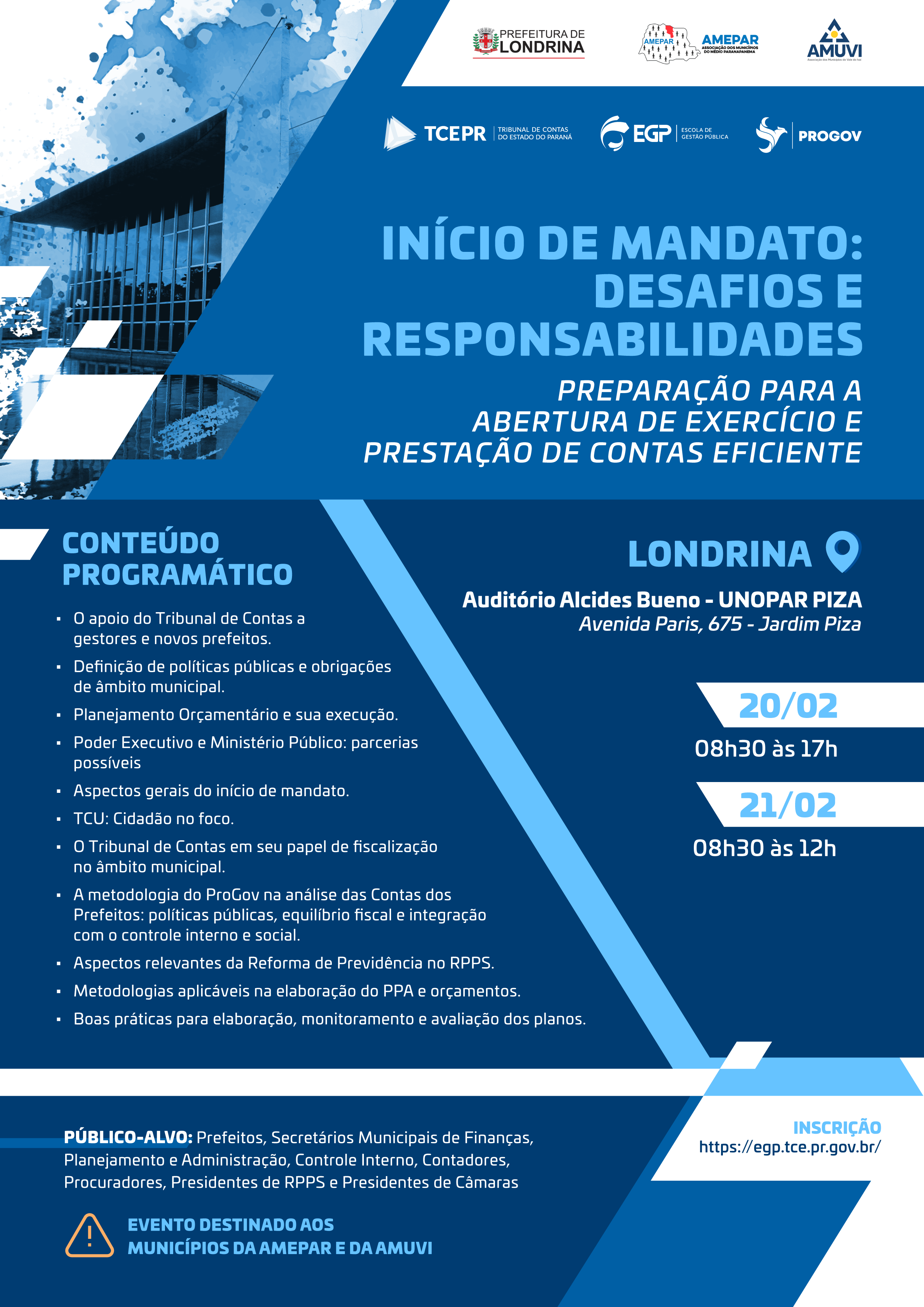 Público-alvo: Prefeitos, Secretários Municipais de Finanças, Planejamento e Administração, Controle Interno, Contadores, Procuradores, Presidentes de RPPS, Presidentes de Câmaras. Próximos eventos: AMOP - 13 e 14/03; AMSULPAR, AMCESPAR, CANTUQUIRIGUAÇU e AMOCENTRO - 20 e 21/03; AMERIOS, AMENORTE e COMCAM - 27 e 28/03; AMUNOP e AMUNORPI - 07 e 08/04; AMUNPAR e AMUSEP - 10 e 11/04.