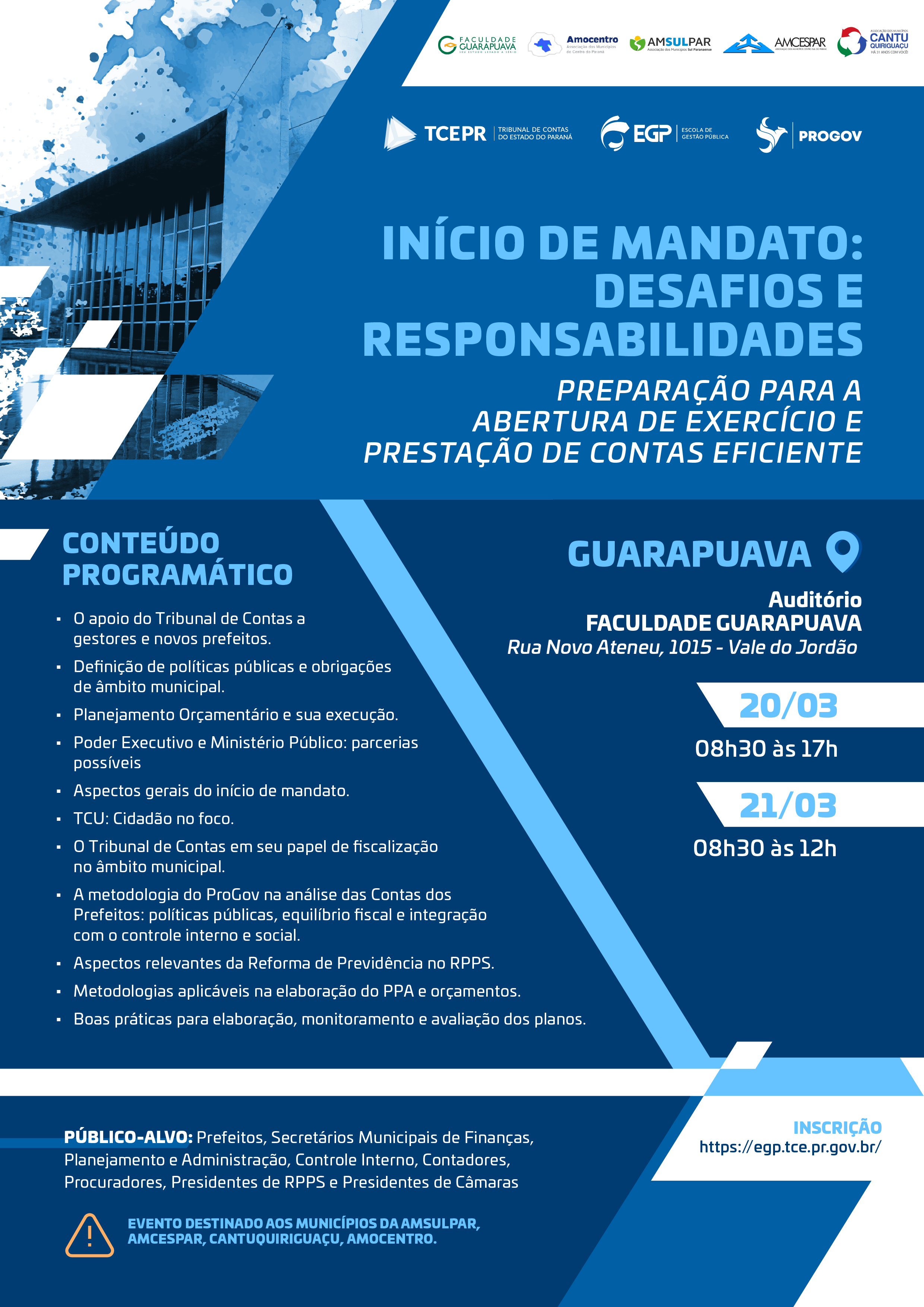 Público-alvo: Prefeitos, Secretários Municipais de Finanças, Planejamento e Administração, Controle Interno, Contadores, Procuradores, Presidentes de RPPS, Presidentes de Câmaras. Próximos eventos: AMERIOS, AMENORTE e COMCAM - 27 e 28/03; AMUNOP e AMUNORPI - 07 e 08/04; AMUNPAR e AMUSEP - 10 e 11/04.