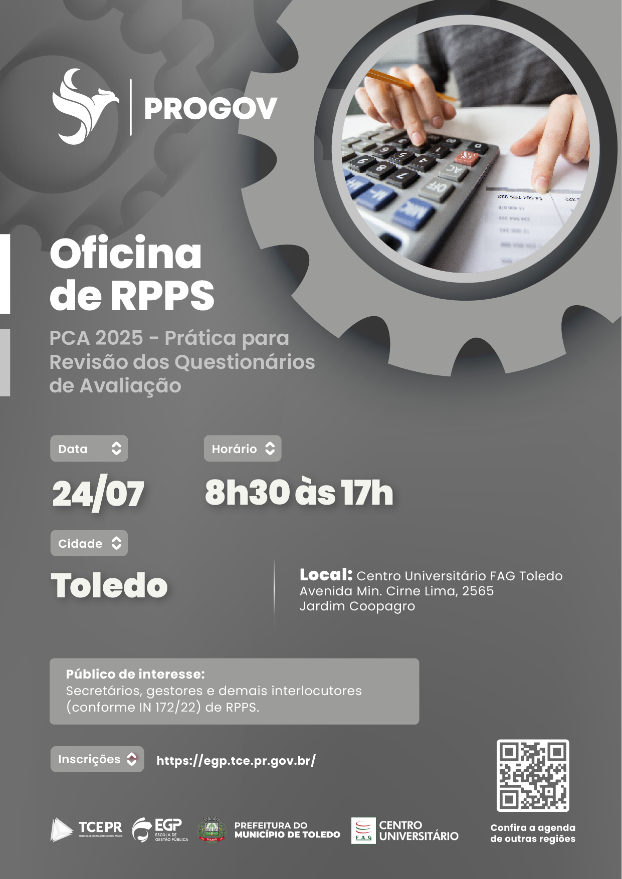DATA: 24/07/25 - 8h30 às 17h LOCAL: Centro Universitário FAG Toledo ENDEREÇO: Av. Min. Cirne Lima, 2565 - Jardim Coopagro, Toledo - PR