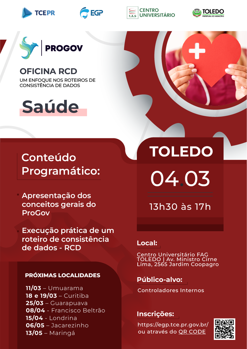 Aprenda, de forma prática, a aplicar os Roteiros de Consistência de Dados (RCD) do ProGov, qualificando as informações municipais e fortalecendo o monitoramento da atuação governamental. A oficina apresenta os conceitos gerais do ProGov e a execução prática de um RCD. Público-alvo: Controladores Internos, Conselhos Municipais e Comissões do Poder Legislativo Municipal.