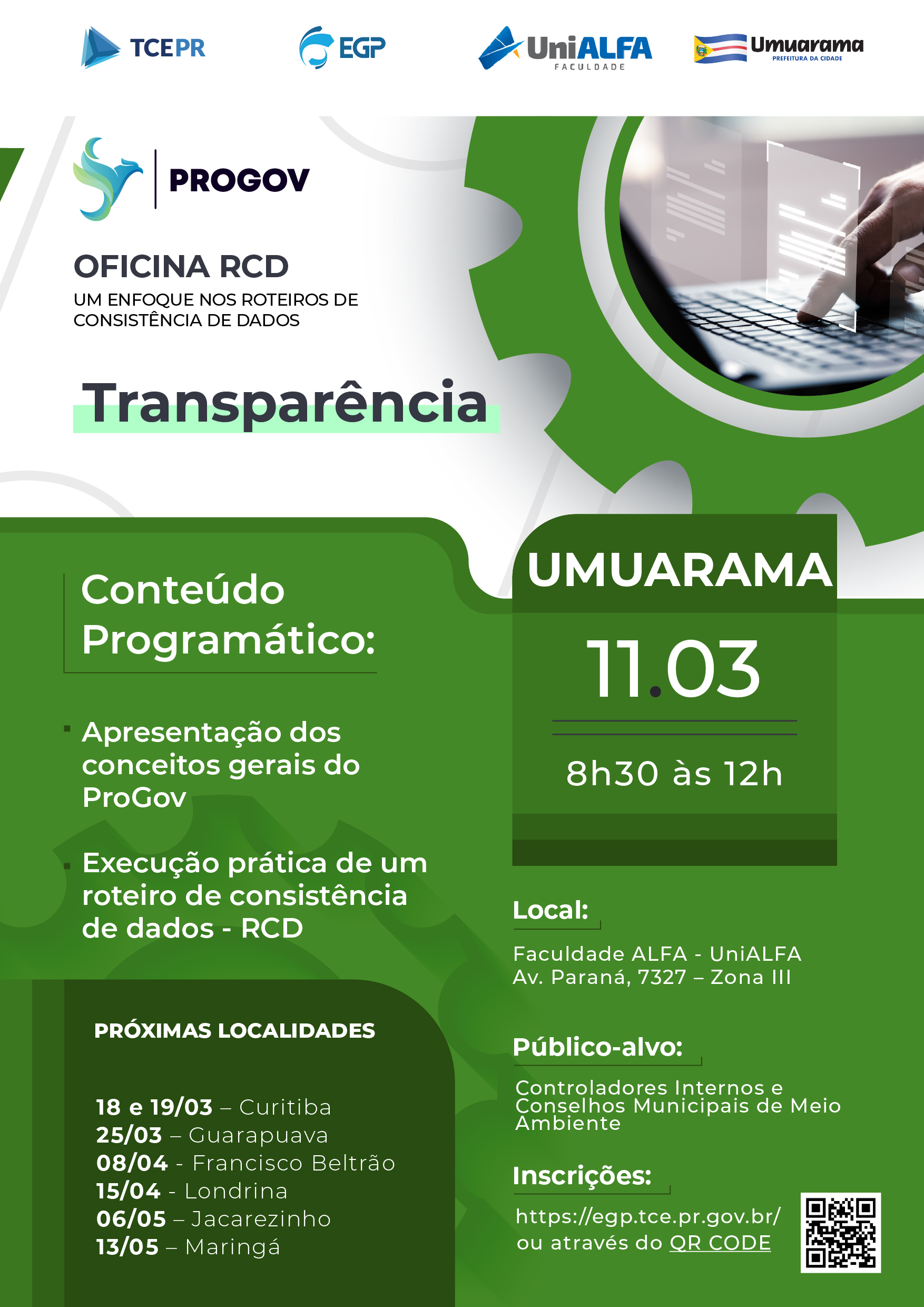 Aprenda, de forma prática, a aplicar os Roteiros de Consistência de Dados (RCD) do ProGov, qualificando as informações municipais e fortalecendo o monitoramento da atuação governamental. A oficina apresenta os conceitos gerais do ProGov e a execução prática de um RCD. Público-alvo: Controladores Internos, Conselhos Municipais e Comissões do Poder Legislativo Municipal.