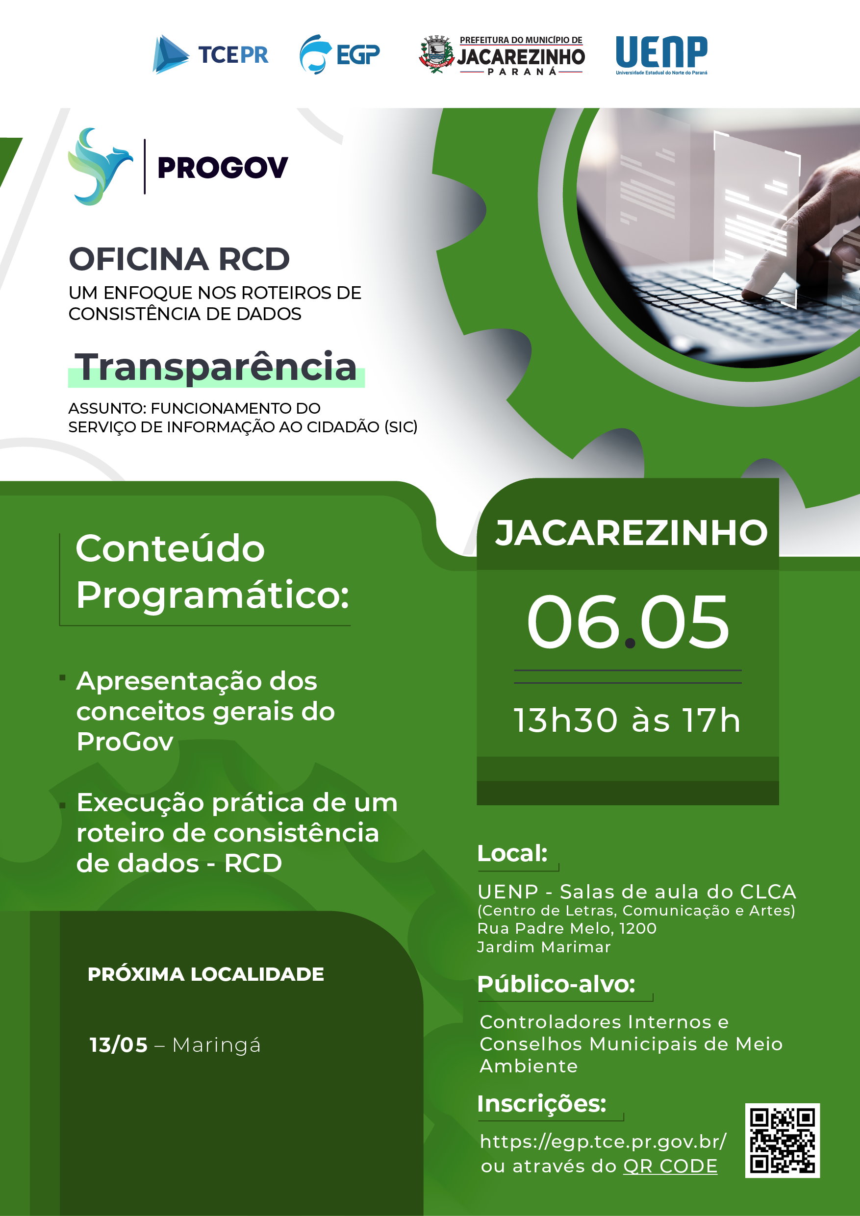 Aprenda, de forma prática, a aplicar os Roteiros de Consistência de Dados (RCD) do ProGov, qualificando as informações municipais e fortalecendo o monitoramento da atuação governamental. A oficina apresenta os conceitos gerais do ProGov e a execução prática de um RCD. Público-alvo: Controladores Internos, Conselhos Municipais e Comissões do Poder Legislativo Municipal.