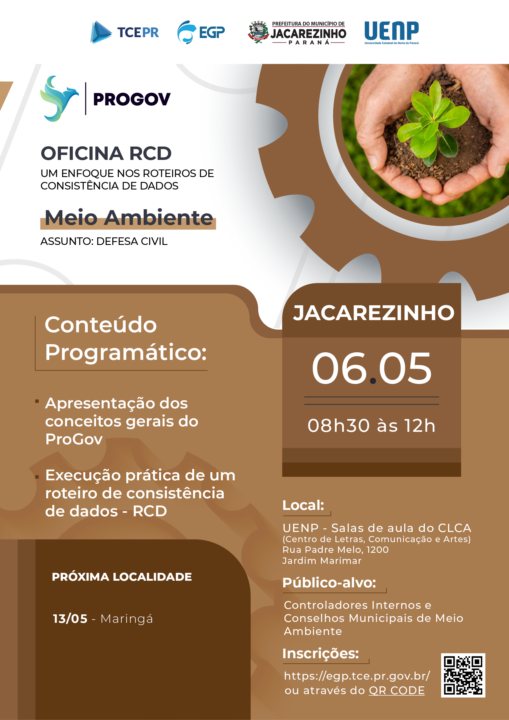 Capacitar os participantes para compreender os conceitos fundamentais do ProGov e aplicar, na prática, os Roteiros de Consistência de Dados (RCD) voltados à área de Meio Ambiente, com foco em DEFESA CIVIL, fortalecendo a qualidade das informações, o monitoramento da atuação governamental e o alinhamento às diretrizes do Tribunal de Contas.