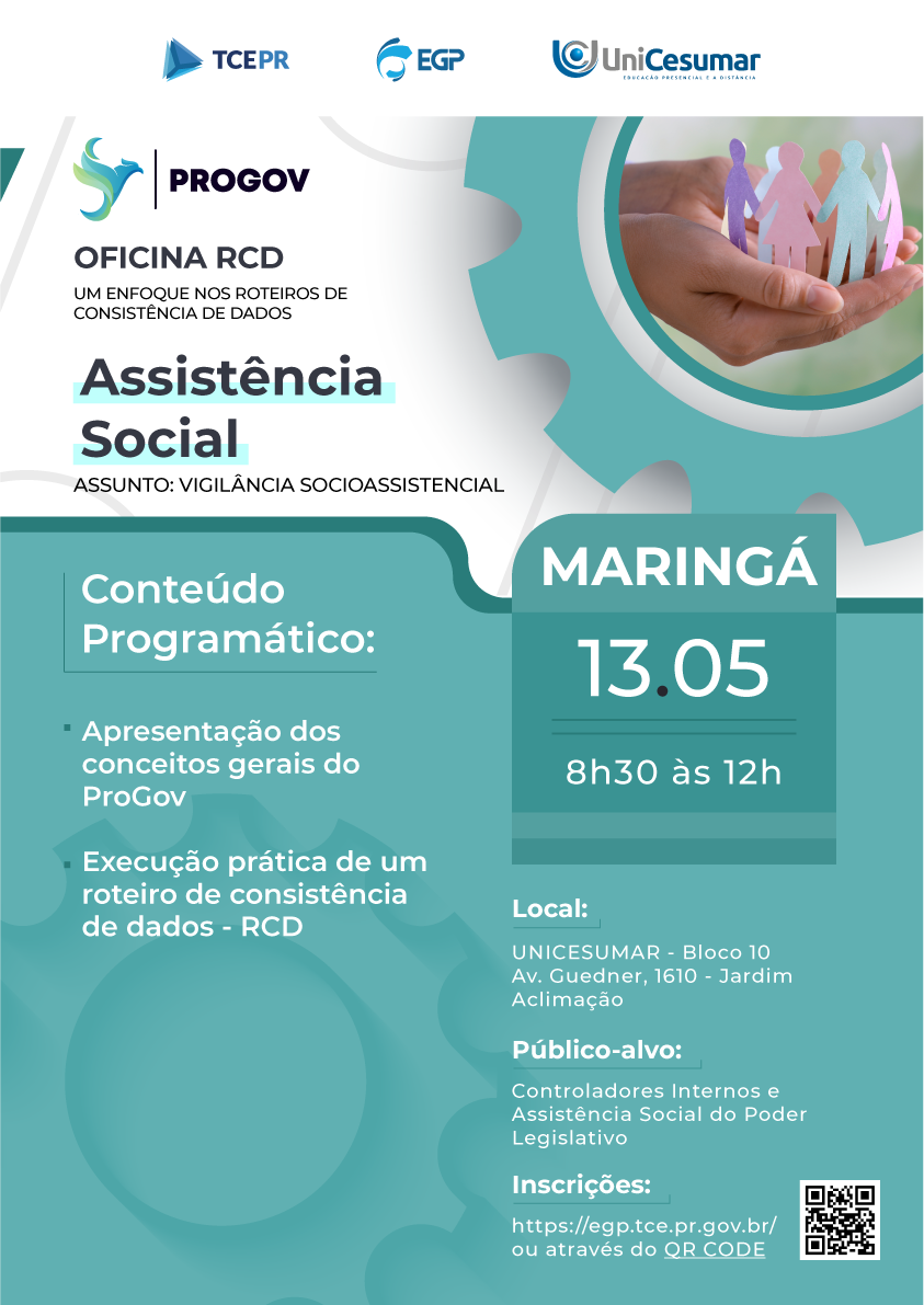 Aprenda, de forma prática, a aplicar os Roteiros de Consistência de Dados (RCD) do ProGov, qualificando as informações municipais e fortalecendo o monitoramento da atuação governamental. A oficina apresenta os conceitos gerais do ProGov e a execução prática de um RCD. Público-alvo: Controladores Internos, Conselhos Municipais e Comissões do Poder Legislativo Municipal.